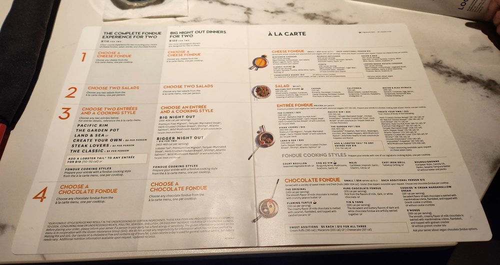 The menu showcases a delightful array of entrées, from succulent Pacific Rim shrimp to savory duck breast. Vegetarians will love the Garden Pot with Impossible polpettes and wild mushroom ravioli. Guests rave about the Wisconsin cheddar and Explosion chocolate fondues that elevate the dining experience to luxurious heights.